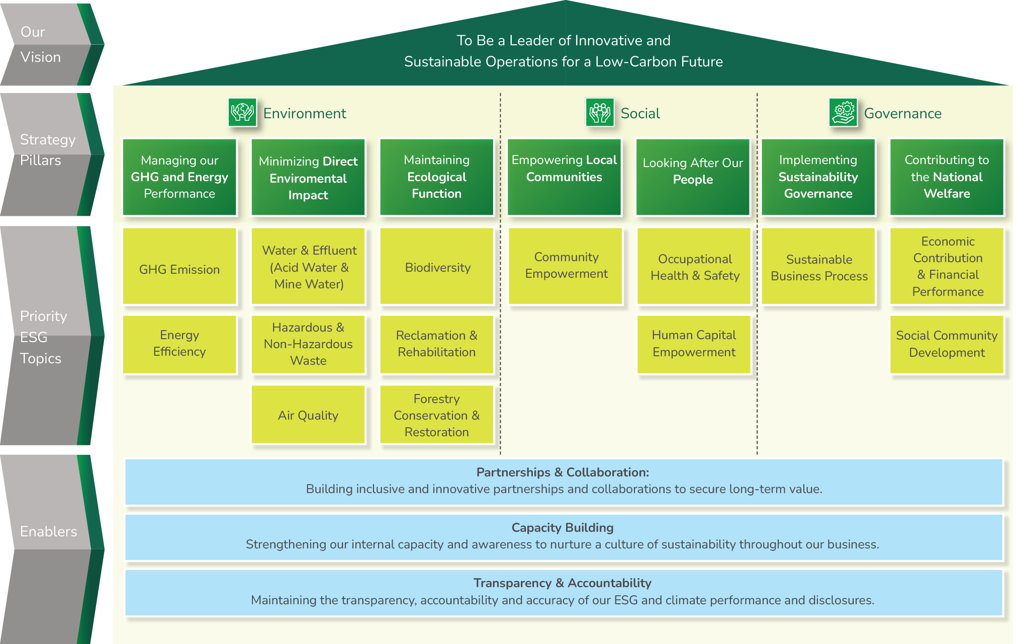 Kerangka Strategi ESG Adaro dibuat sebagai panduan utama untuk mengenali, mengurangi, dan mengelola risiko terkait aspek lingkungan, sosial, dan tata kelola yang muncul dari kegiatan usaha Adaro. Ketiga aspek ESG tersebut diprioritaskan berdasarkan tingkat kepentingannya (materialitas) dan seberapa besar kaitannya dengan model bisnis Perseroan. Di dalam kerangka ini juga terdapat berbagai enablers, yaitu fondasi yang menjadi dasar penyusunan peta jalan (roadmap), program, dan inisiatif ESG Adaro. Mengikuti arah kebijakan dan praktik global, Adaro menempatkan pengelolaan emisi gas rumah kaca (GRK) dan peningkatan kinerja energi sebagai salah satu fokus utamanya.
