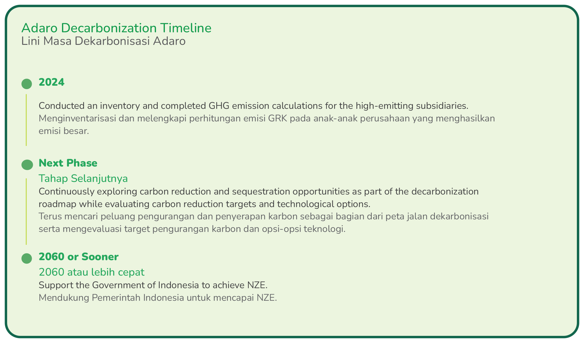 PT Adaro Andalan Indonesia Tbk beserta anak-anak perusahaannya (“Adaro”) menyatakan dukungan terhadap kebijakan pemerintah Indonesia dalam pengurangan emisi gas rumah kaca (GRK), termasuk upaya untuk merealisasikan net-zero emissions (NZE) pada tahun 2060 atau lebih cepat. Dalam kerangka komitmen tersebut, Adaro telah menyusun seperangkat strategi dekarbonisasi.