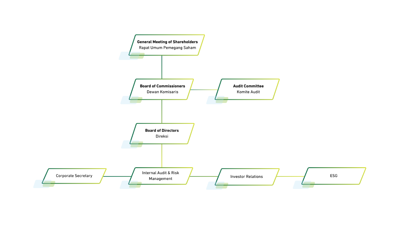 Komitmen penerapan prinsip-prinsip GCG dijalankan di seluruh tingkatan organisasi Adaro, mulai dari Dewan Komisaris, Direksi, hingga jajaran manajemen dan karyawan.